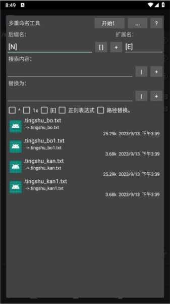 在重命名工具中,你可以进行名称设置,该工具支持正则表达式与路径替换功能,完成设置后点击“开始”按钮即可执行操作。