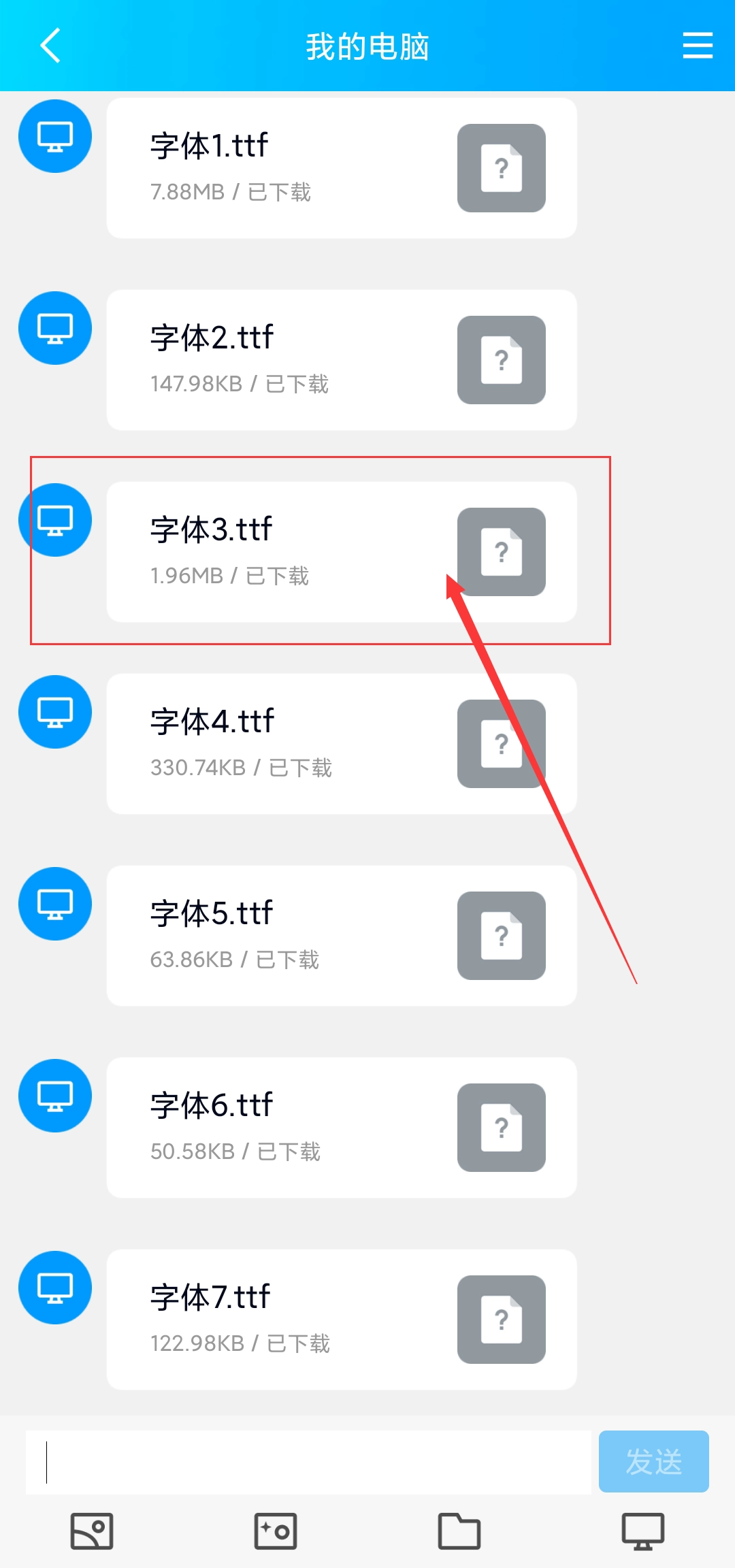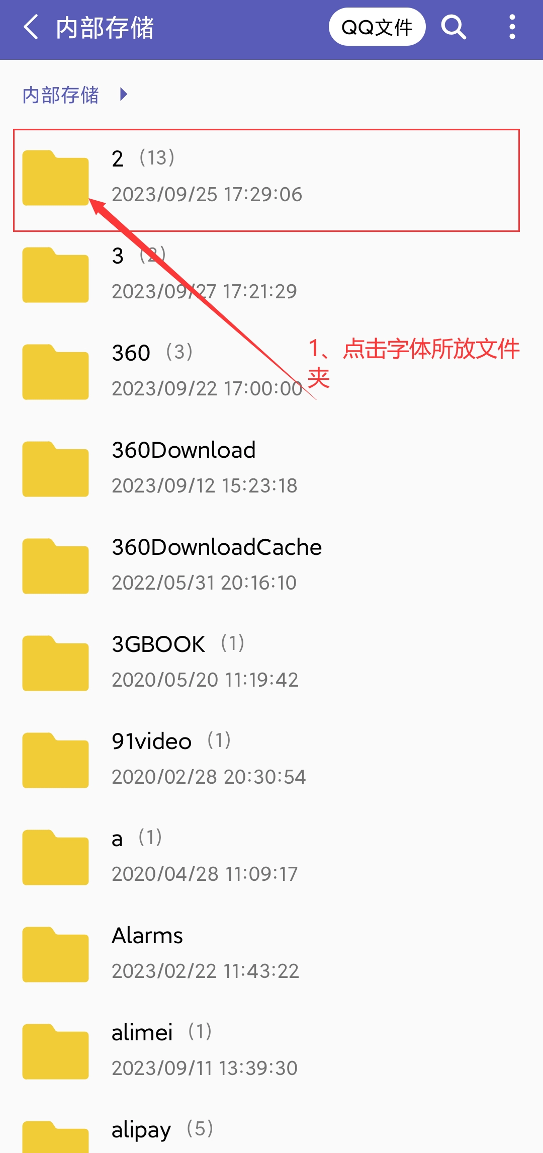 5、系统会自动跳转至内部存储页面,接着找到字体所在的文件夹并选中,最后点击“字体”选项即可。