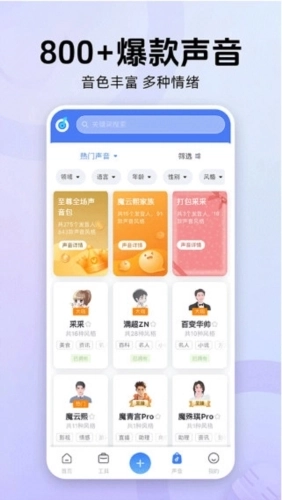 软件内设有专属配音模式,能为用户提供高质量的配音方案与便捷的选择服务——无论是广告宣传配音,还是影视动漫配音,都能在这里找到对应的模式,用户可放心尝试。目前,该软件适用于短视频配音、新闻播报、有声书录制、有声电台制作等多种场景,提供300多款不同声音、600余种风格选择,更有“满超”“采采”等明星大咖的声音入驻,操作简单易上手,足以满足多数用户的配音需求。