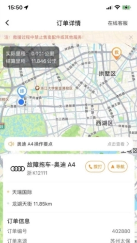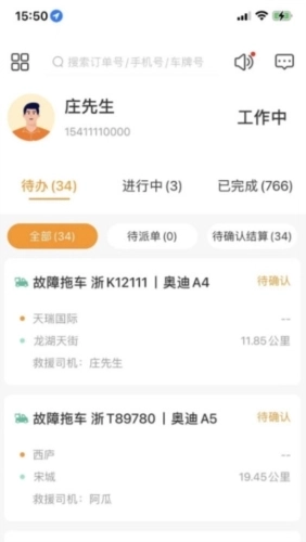 3、待办基础信息便捷呈现,每个待办工单页面都为用户清晰展示了救援公里数、剩余分钟等多种内容;