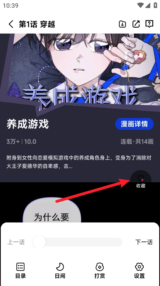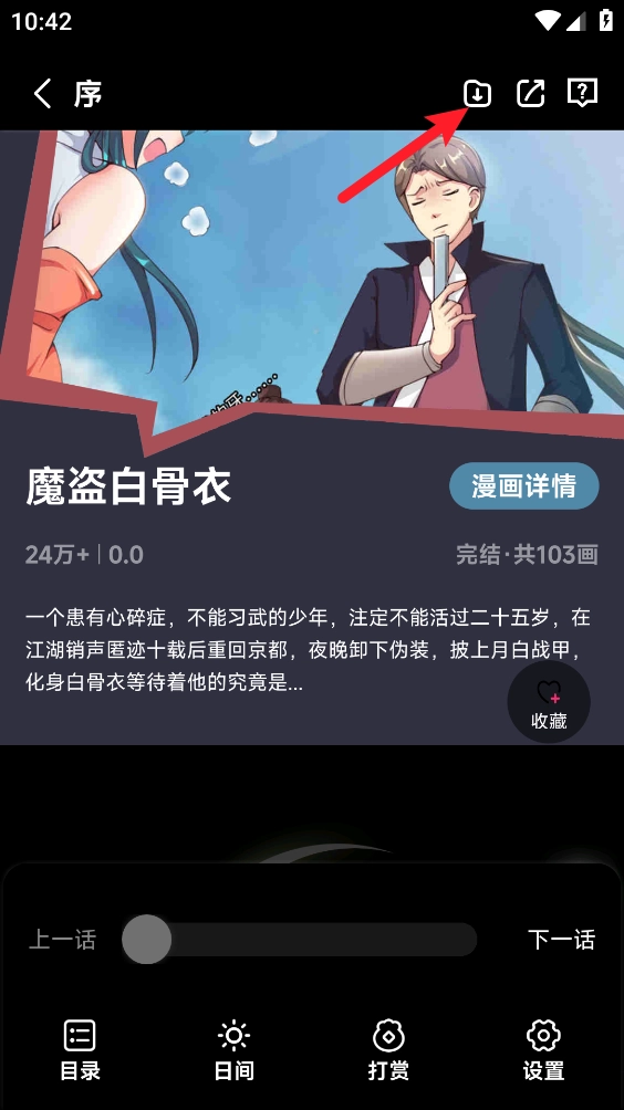2、在漫画阅读界面点击中间区域呼出菜单,点击图中的“收藏”按钮。