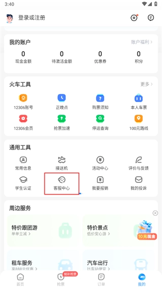 1、打开软件后,界面下方设有首页、抢票、订单、我的四个分类,我们先选择“我的”。接着在列表里找到客服中心,点击进入即可。