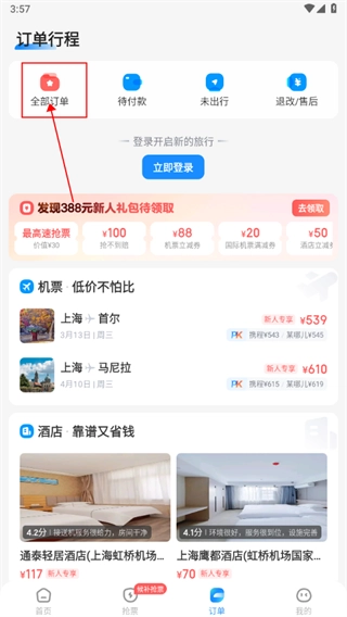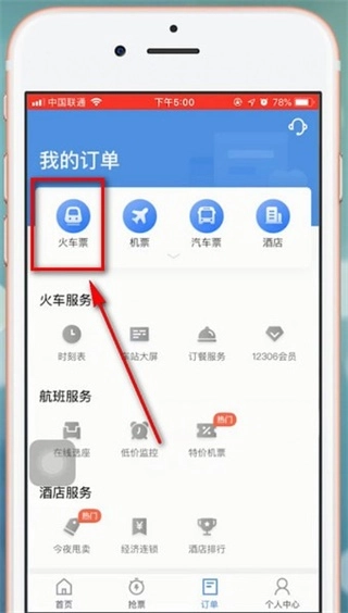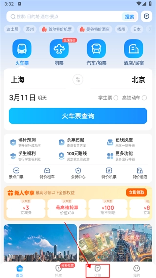 1、打开智行火车票APP的首页,接着点击页面底部功能栏里的“订单”选项。