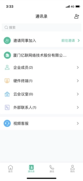 2、企业通讯录:可查看企业联系人,涵盖企业成员、硬件终端、云会议室以及外部联系人等类别。