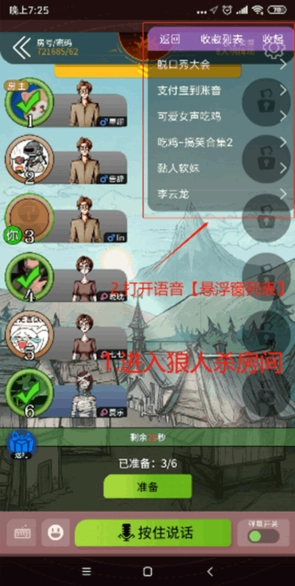 2、以狼人杀为例:进入狼人杀房间后,打开悬浮窗语音列表。