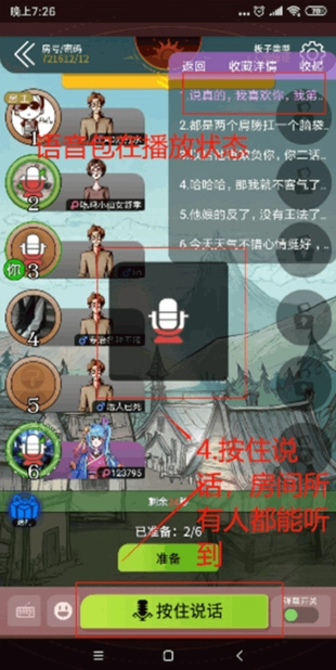 4、当语音包处于播放状态时,点击界面中的麦克风【按住说话】按钮,房间内的所有成员都能听到语音包播放的声音。