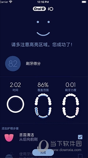 每次刷牙指导课程结束后,您可以上拉查看刷牙数据摘要,通过刷牙分数快速掌握自己的刷牙状况。