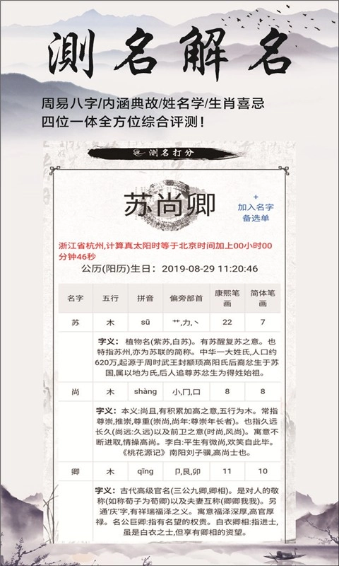 3、测名解名:融合八字喜用神匹配、文化内涵典故溯源、姓名学三才数理评分、民俗生肖喜忌分析,打造四位一体的综合姓名评测!