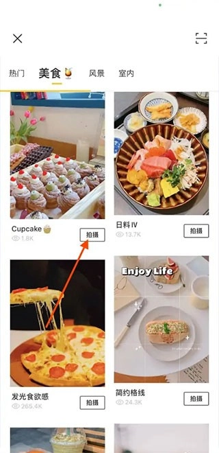 打开【美食】标签栏,选择拍照效果,点击【拍摄】。