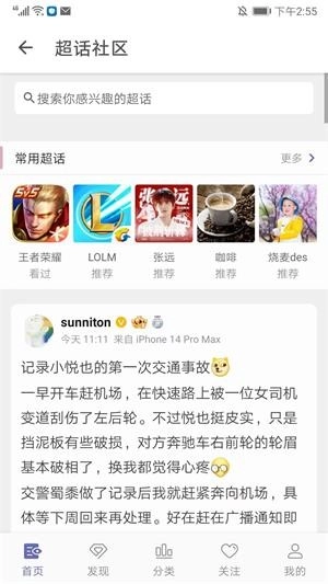 3、进入超话社区界面后,能看到首页、发现、分类、关注和我的这些分栏,用户可以依据自身需求挑选对应的类型。