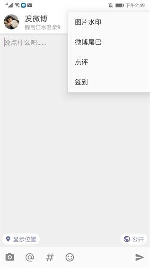 3、可以看到图片水印、微博尾巴、点评以及签到等选项,我们点击【微博微博】这个选项。