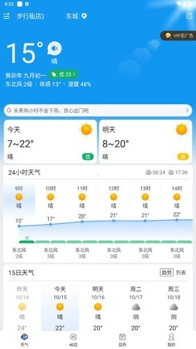 ①15日的天气、风向、紫外线强度、温度以及空气质量预报。