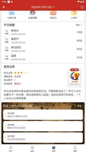 3、【日历】功能其实就是万年历功能,大家可以查看所有日历相关的数据,也能了解今天适合做什么之类的信息,当然这些都是最基础的内容,大家可以作为参考。