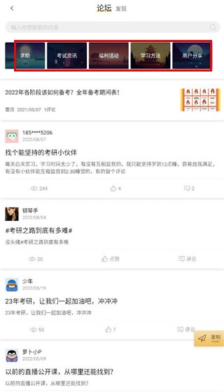 2、这里面既可以发起求助,也能浏览各类学习方法,还可以将自己的学习心得分享出来。