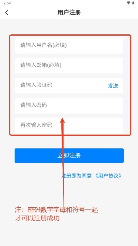 注:密码必须要数字+字符+字母都有并且大于8位数才可以注册成功;