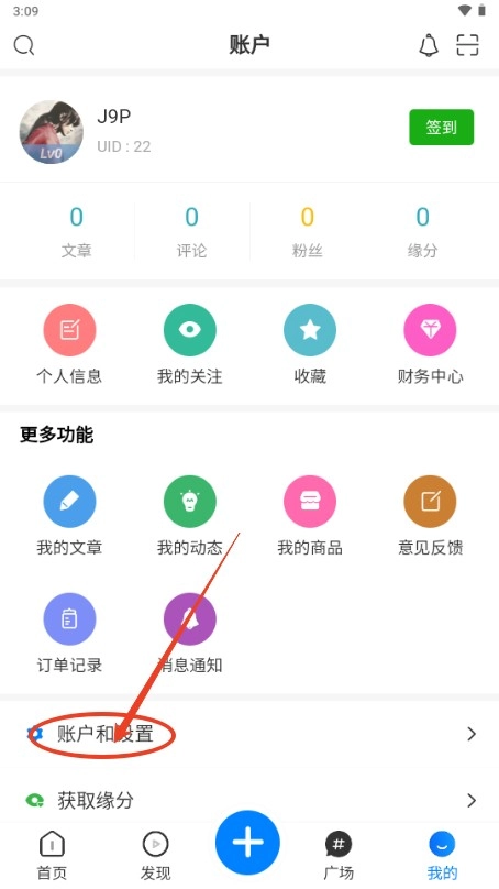 2、点击账户和设置;
