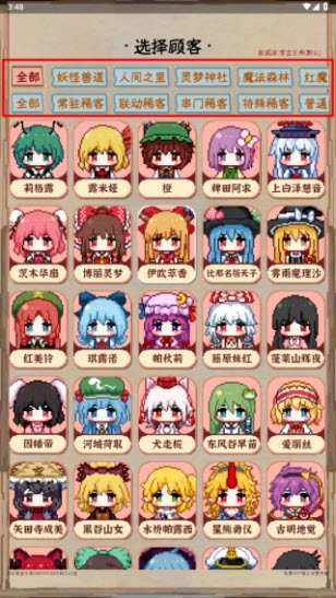 2、在首页,我们能够依据不同条件对顾客进行筛选,例如妖怪兽道、人间之里、灵梦神社、魔法森林、常驻稀客、联动稀客等类别。
