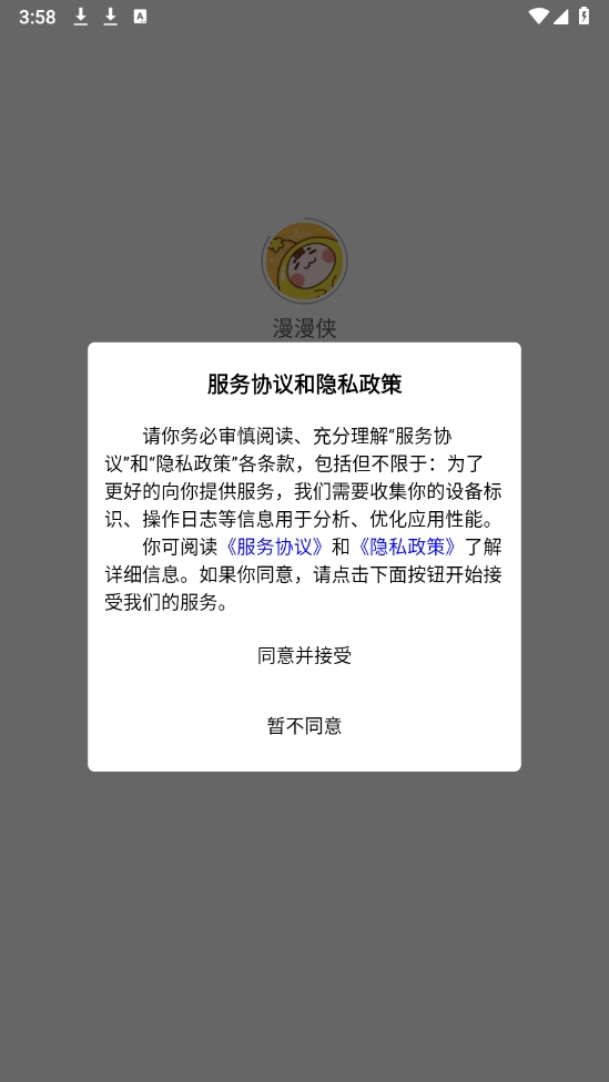 1、漫漫侠,同意相关的政策与协议之后打开。