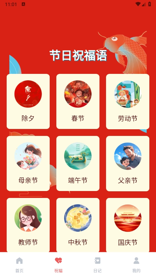 4、在“祝福”板块,有每个节日的祝福语推荐。