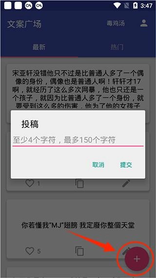 4、点击下方的加号选项,用户即可参与文案投稿,将自己钟爱的文案或是原创的优美句子分享出来,供大家一同欣赏。