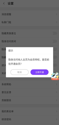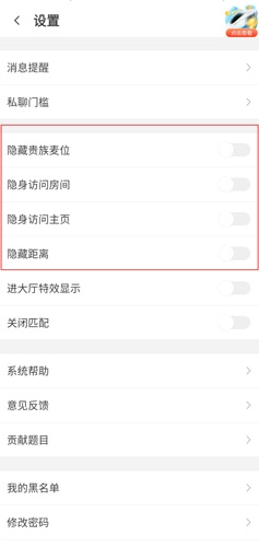 2、用户在设置页面可点击四个按钮,分别对应隐藏贵族麦位、隐身访问房间、隐身访问主页以及隐藏距离功能。
