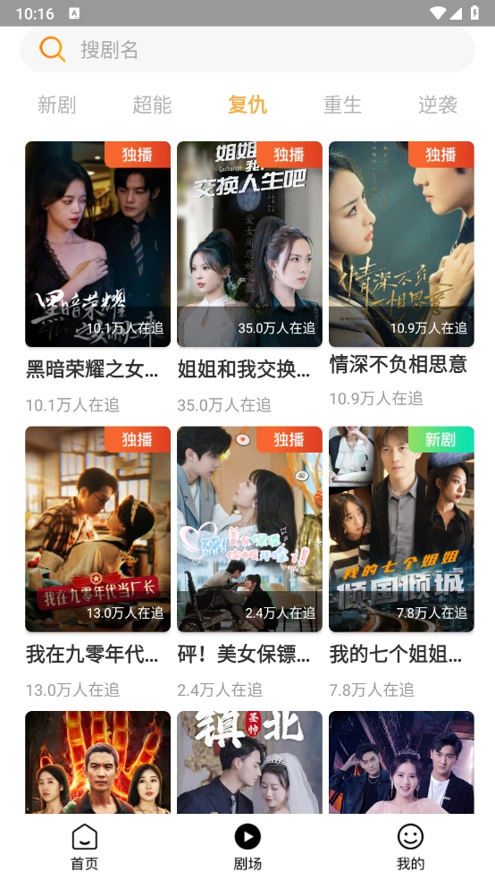 2、进入首页和剧场页面,这里为大家准备了丰富多样的短剧资源,涵盖新居、复仇、重生等不同类型。
