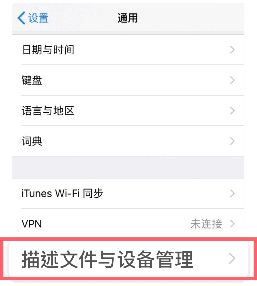 第三步:进入通用,点击描述文件与设备管理