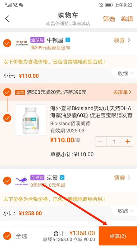 3、点击“购物车”图标,勾选需要购买的商品后,点击页面右下方的“结算”按钮完成结账流程。