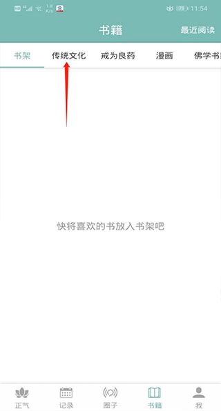 2、用户可以挑选不同类别的书籍来阅读,还能把喜爱的书籍收藏到书架里。在此选择“传统文化”这一分类。