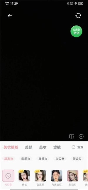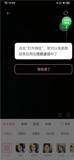 3、进入设置界面后,界面下方设有美妆模板、美颜、美妆、滤镜等功能选项,用户能够自主调整微信视频通话时的美颜效果。