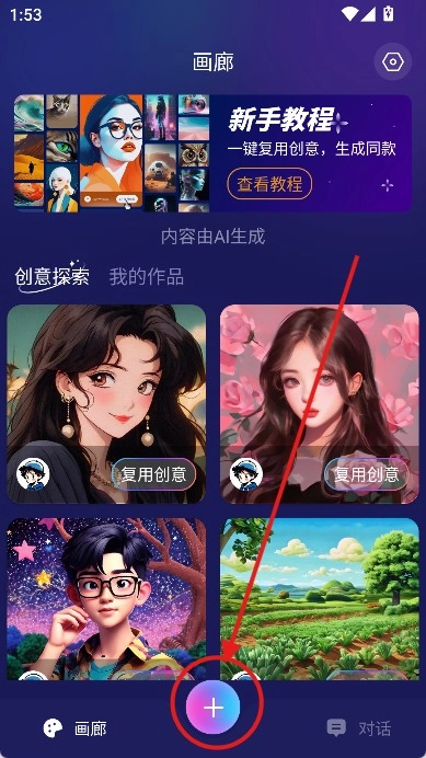 1、使用Midjourney完成绘画后,打开并进入该软件,点击界面下方的【+】按钮;