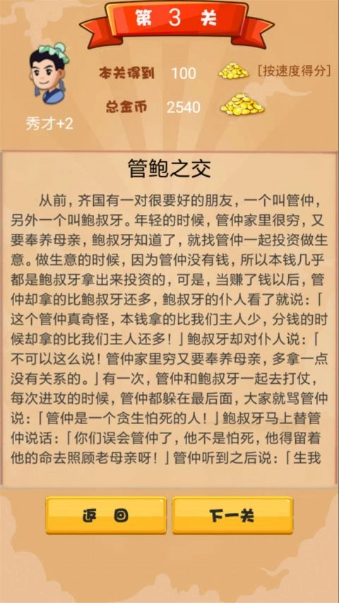 2.每一关解锁后都能阅读一则对应的成语故事,在趣味中学习知识。