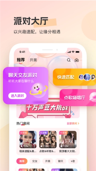 2、兴趣速配:派对大厅以共同兴趣爱好为连接纽带,助力人们快速找到志同道合的有缘人,让每一次相遇都洋溢着意外的惊喜。
