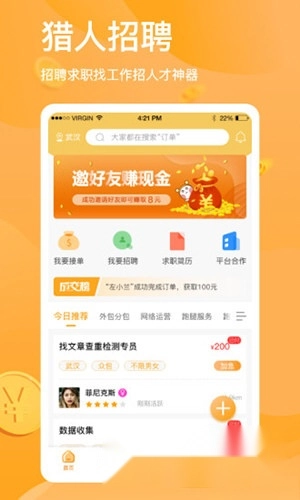 猎人招聘任务支持在线担保交易,通过在线沟通即可轻松接单,让工作更自由。