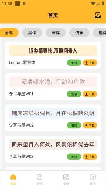 换字体是一款实用的字体美化工具,拥有海量字体资源,用户能通过平台快速预览并选择心仪的字体,让屏幕展现独特风格。除了字体功能,换字体还提供丰富的高清壁纸资源,涵盖多种主题,满足你对界面美化的所有期待。不管是想换上酷炫字体,还是需要一张清新壁纸,换字体都能轻松实现。换字体支持一键应用心仪字体,让你无缝完成字体更换,操作简单便捷。