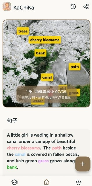 6、KaChiKa能够自动识别用户导入的素材,智能生成用于学习的语言单词,并且会搭配一段句子来对图片进行描述