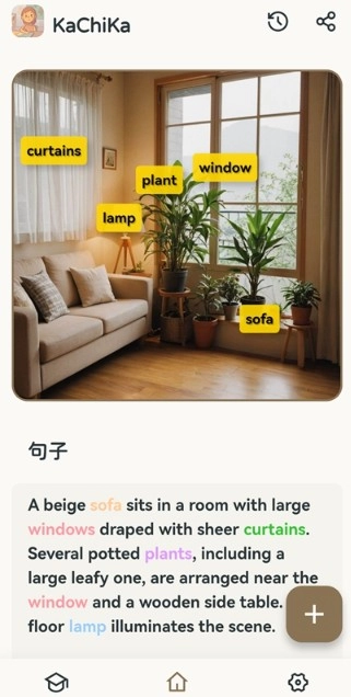 1、KaChiKa可对图片内容展开分析,自动生成与之相关的外语单词和实用例句,所有单词标签都能点击发音,为学习者和用户营造沉浸式学习体验。