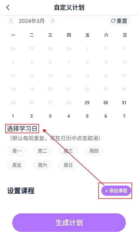 4、若用户选择智能定制模式,系统会依据课程直接生成学习计划;若用户选择自定义模式,则需先选定日期和学习日,添加好课程后点击生成按钮,即可完成学习计划的创建。