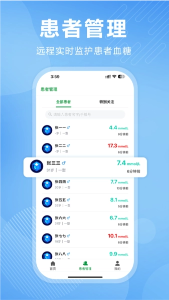 患者管理:通过在线方式记录并管理所有血糖患者的详细信息,方便随时跟进每位患者的身体健康状况。
