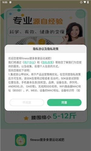 1、在本站Fitness健身食谱运动减肥板块,打开对应的软件,点击同意隐私协议与相关政策。