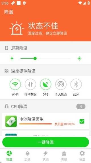 2、【一键降温】从CPU、硬件到屏幕多维度实现降温,同步完成内存清理与垃圾清理,在降温的同时有效解决设备卡顿问题;