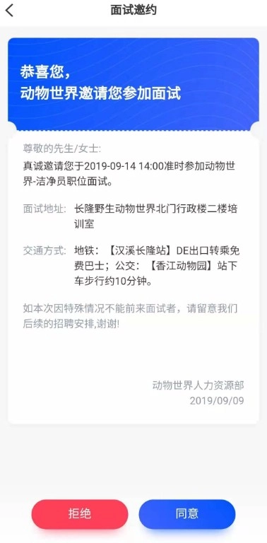 6、收到面试邀约后,请点击“同意”,并按照HR发送的对应时间前来面试,面试时需出示面试邀约相关信息。若未收到面试邀约,当天将不安排面试。