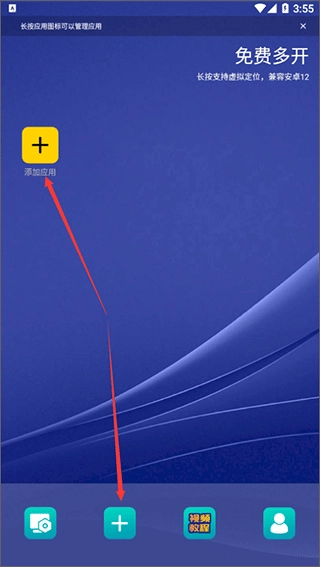 1、打开虚拟双开王,进入软件后,点击“添加应用”或者下方的“+”按钮,就能添加软件来实现多开。