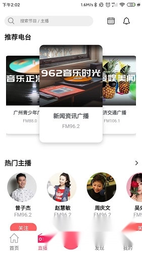 包含四档电台直播节目,分别是FM96.2新闻资讯、FM102.7汽车音乐、FM106.1交通电台以及FM88.0都市生活。