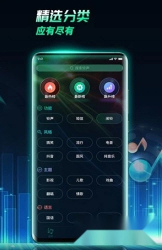 【精选分类】铃声分类细致多样,涵盖原唱、翻唱、恶搞、影视金曲、动漫、抖音网红热歌、DJ舞曲、伤感语录等多种类型;