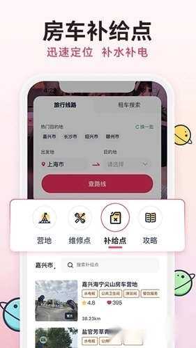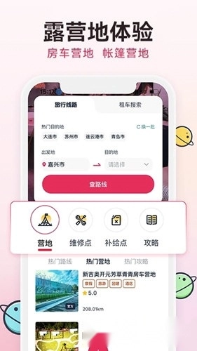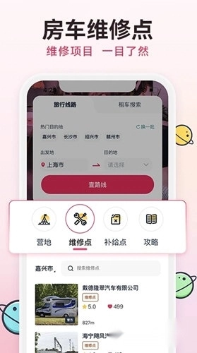 房车+营地:去野星球为广大房车用户与旅行者提供营地搜索、预订、线路规划、维修点、补给点、停车点查询及攻略等“一站式”服务。