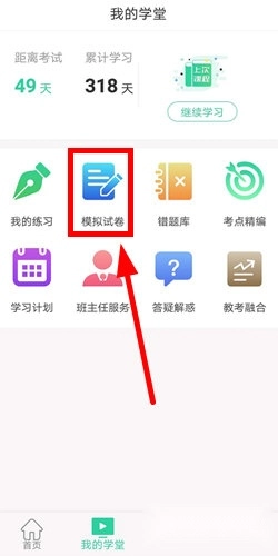 1、在“我的学堂”功能界面里,找到并点击“模拟试卷”这一功能选项。