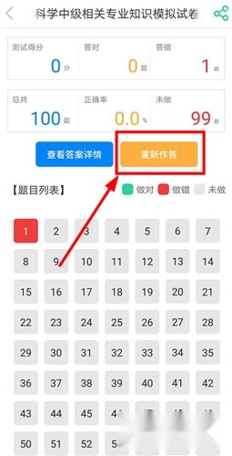 2、接着参与里面的题目训练,答题完成后会出现“重新作答”的功能,点击该功能就能重新考试。