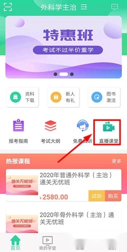 1、打开医考学堂并登录,然后进入“直播课堂”的功能界面。