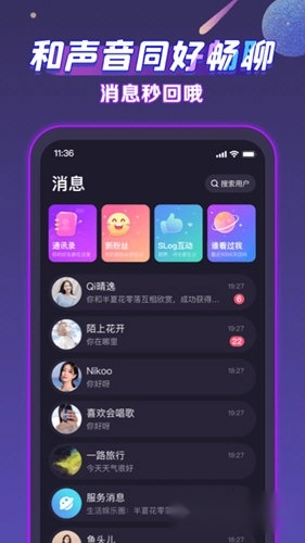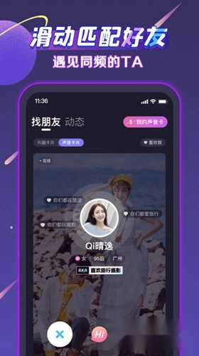 1、声音匹配:左右滑动屏幕,就能邂逅心仪的声音与有趣的伙伴,还能和TA一同合唱歌曲、演绎台词片段。